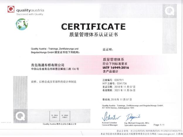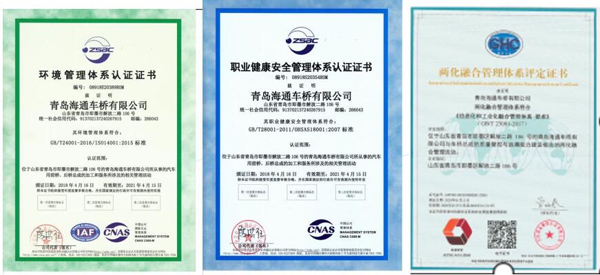 青島海通車橋有限公司成立于1994年,注冊資金2000萬元,位于山東省青島市即墨區(qū)解放二路106號。公司先后獲得“中國誠信企業(yè)”、“國家級認(rèn)可實(shí)驗(yàn)室”、“高新技術(shù)企業(yè)”、“山東省企業(yè)技術(shù)中心”、“山東省守合同重信用企業(yè)”、“山東省著名商標(biāo)”、“質(zhì)量信用AAAAA級企業(yè)”、“AAA級企業(yè)信用等級”等榮譽(yù)。先后通過了質(zhì)量、環(huán)境、職業(yè)健康安全、兩化融合等管理體系認(rèn)證。